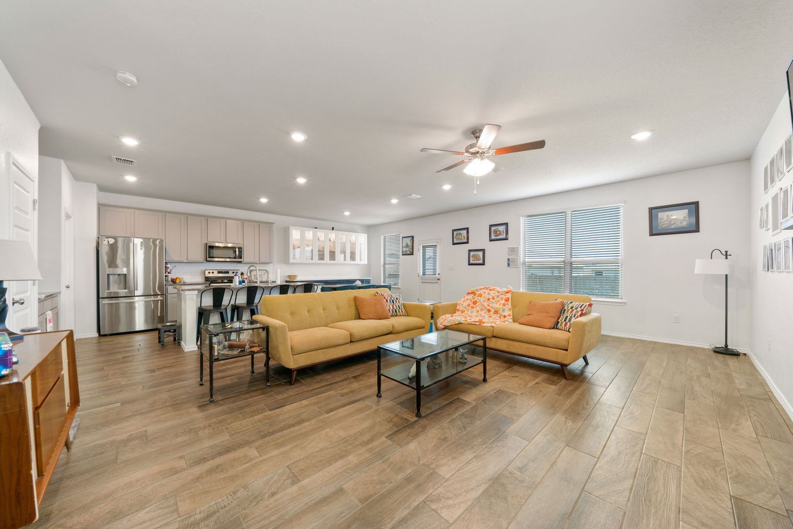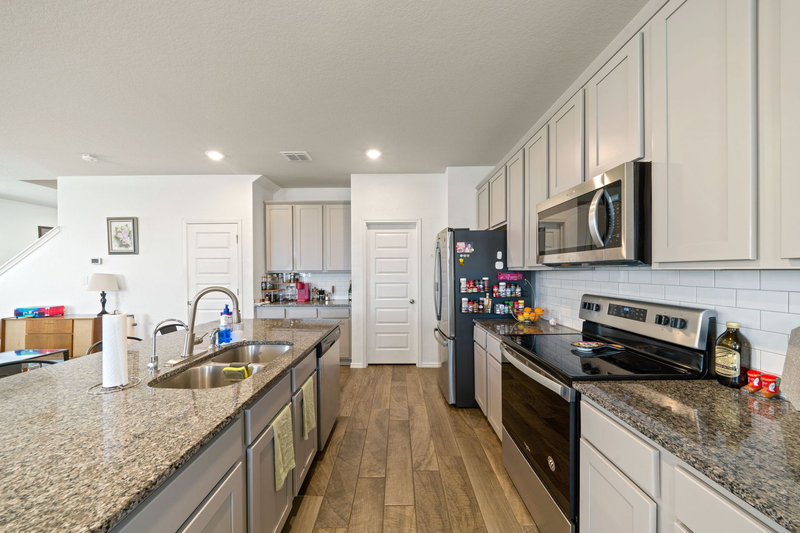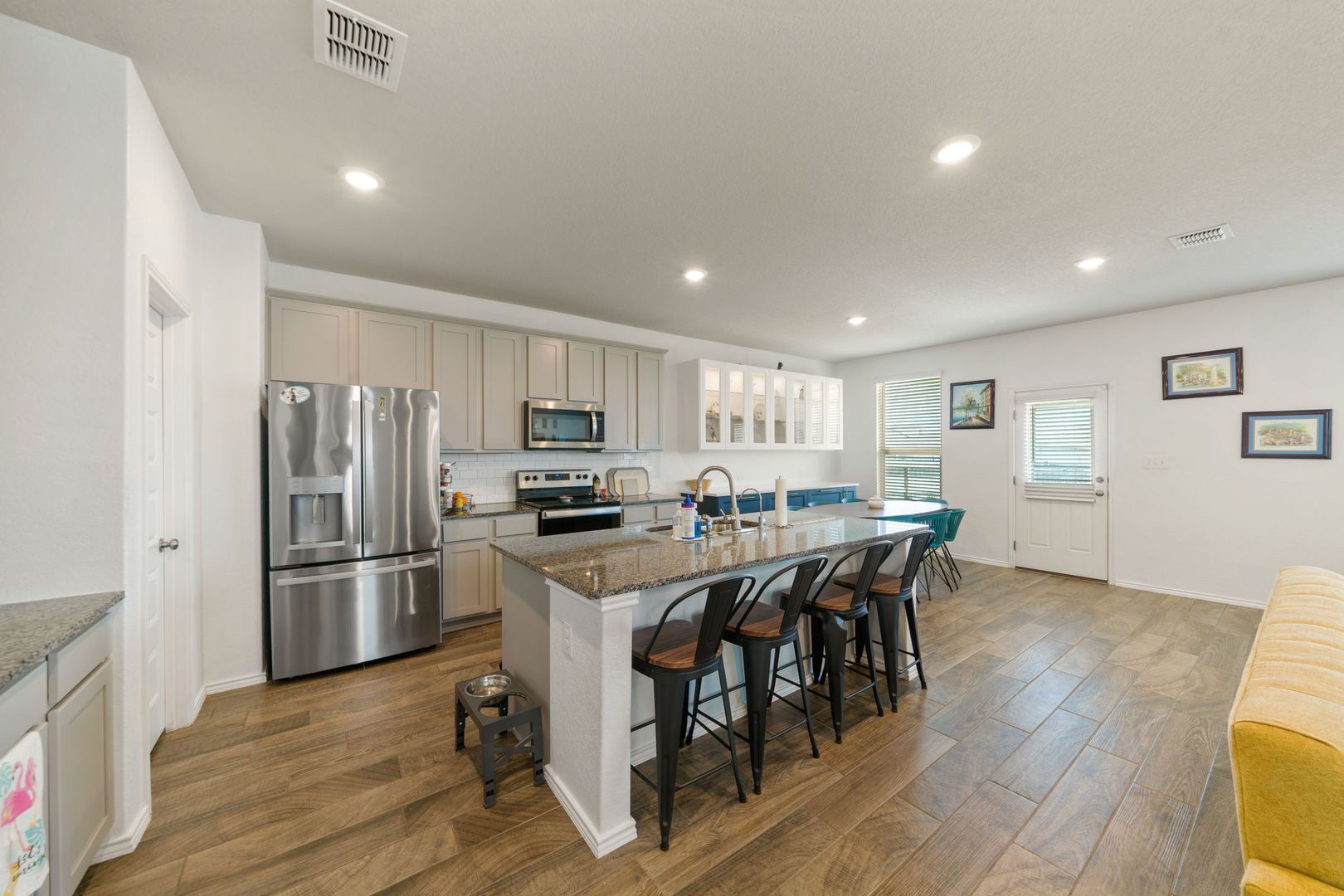 Gorgeous 4-bedroom, 3-bathroom home now available in the highly sought-after Millican Grove subdivision in Converse, TX. From the moment you step inside, you’ll be welcomed by an inviting entryway that opens to a spacious, open-concept living room, kitchen, and breakfast area—all highlighted by stylish ceramic plank tile flooring throughout the downstairs. The kitchen is a true chef’s dream, featuring granite countertops, a custom tiled backsplash, upgraded shaker-style cabinetry, and sleek stainless steel appliances. The breakfast area includes additional cabinetry and counter space, complete with built-in LED lighting—perfect for entertaining or everyday use. Upstairs, you’ll find a generously sized master suite with a spa-like en-suite bathroom that offers dual vanities, a large walk-in shower, and an expansive walk-in closet. Two additional bedrooms, a full secondary bathroom, and a spacious game room are also located upstairs. For added flexibility, a fourth bedroom and third full bathroom are conveniently located on the first floor. Step outside to enjoy the oversized backyard with a covered patio—ideal for weekend BBQs or relaxing evenings. Additional highlights include solar panels to help reduce electric bills and numerous upgrades throughout the home. With easy access to I-10, Loop 1604, The Forum, and Randolph AFB, this home combines comfort, style, and convenience. A true pleasure to show!