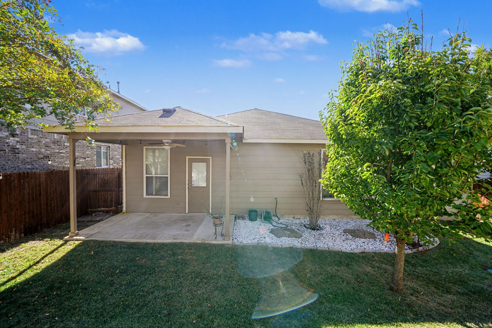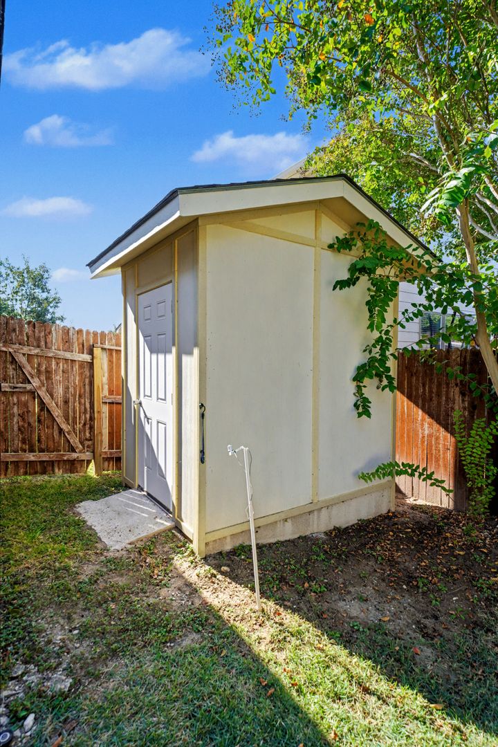 Discover this stunning 3-bedroom, 2-bathroom home nestled in the sought-after Alamo Ranch subdivision. Step through the impressive entryway and past a versatile flex room-perfect for a home office, study, or playroom-into the open-concept kitchen, dining, and living area. The kitchen is a true showpiece, featuring granite countertops, a stylish tiled backsplash, upgraded cabinetry, and a large center island ideal for meal prep and entertaining. Matching stainless steel appliances, including a refrigerator, convey for added convenience. The spacious primary suite is thoughtfully separated from the secondary bedrooms, offering enhanced privacy. It includes a luxurious en-suite bath with dual vanities and an extended walk-in shower. Both secondary bedrooms are generously sized and feature ceiling fans for year-round comfort. Outside, enjoy a charming and private backyard complete with a covered patio-perfect for morning coffee or evening relaxation-surrounded by mature trees. A separate storage shed provides ample room for all your extra belongings. Ideally located near top-rated schools, shopping, dining, and entertainment, this home also offers quick access to Loop 1604 and Highway 151. A true pleasure to show!