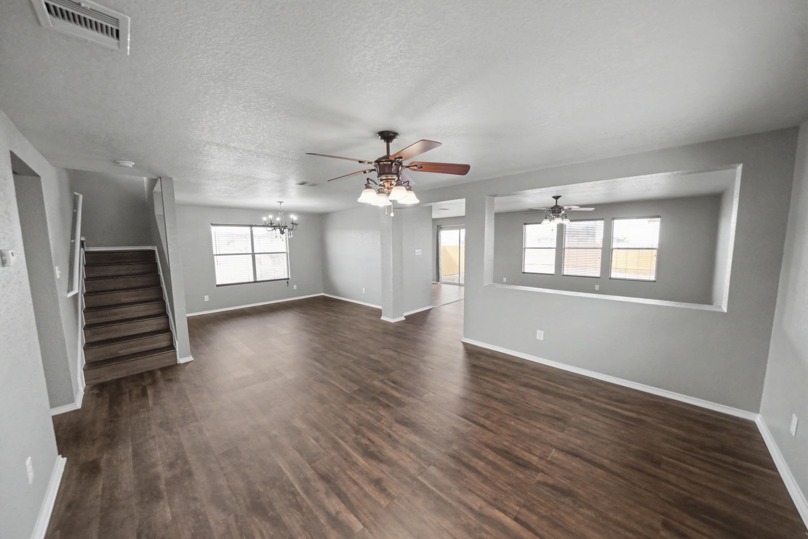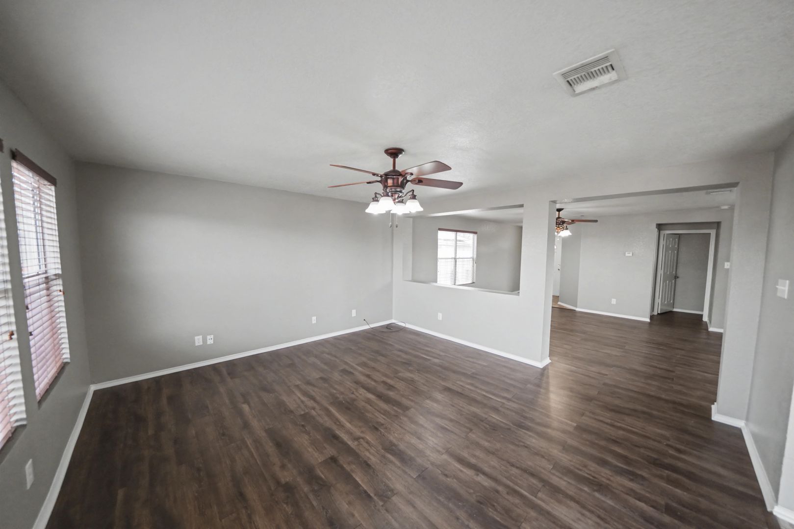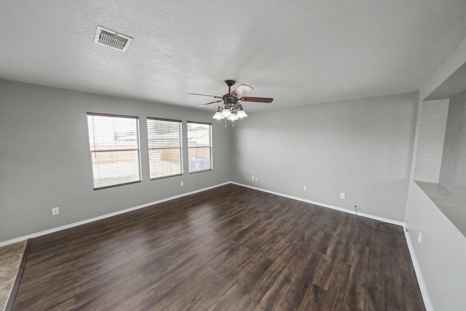 Charming two-story home tucked away at the end of a quiet cul-de-sac in the quaint Bradbury Court subdivision. The welcoming entry opens into a spacious main living area that flows seamlessly into the formal dining space, featuring updated vinyl plank flooring throughout the main level. The home has also been freshly painted, giving it a clean, modern, and move-in-ready feel. A secondary living area, separated by a half wall, opens to the kitchen, which comes fully equipped with all appliances, including a refrigerator—perfect for both everyday living and entertaining. All bedrooms are located upstairs, along with a versatile game room that offers additional living or flex space. The entire upper level features brand-new vinyl plank flooring, providing a cohesive look with durability and easy maintenance. The primary suite is generously sized and includes an en-suite bathroom with a single vanity and a tub/shower combination. Enjoy an oversized backyard with added privacy, as the property backs up to a greenbelt. With fresh interior paint, updated flooring on both levels, and a functional, well-designed layout, this home is private, well maintained, and truly a pleasure to show.